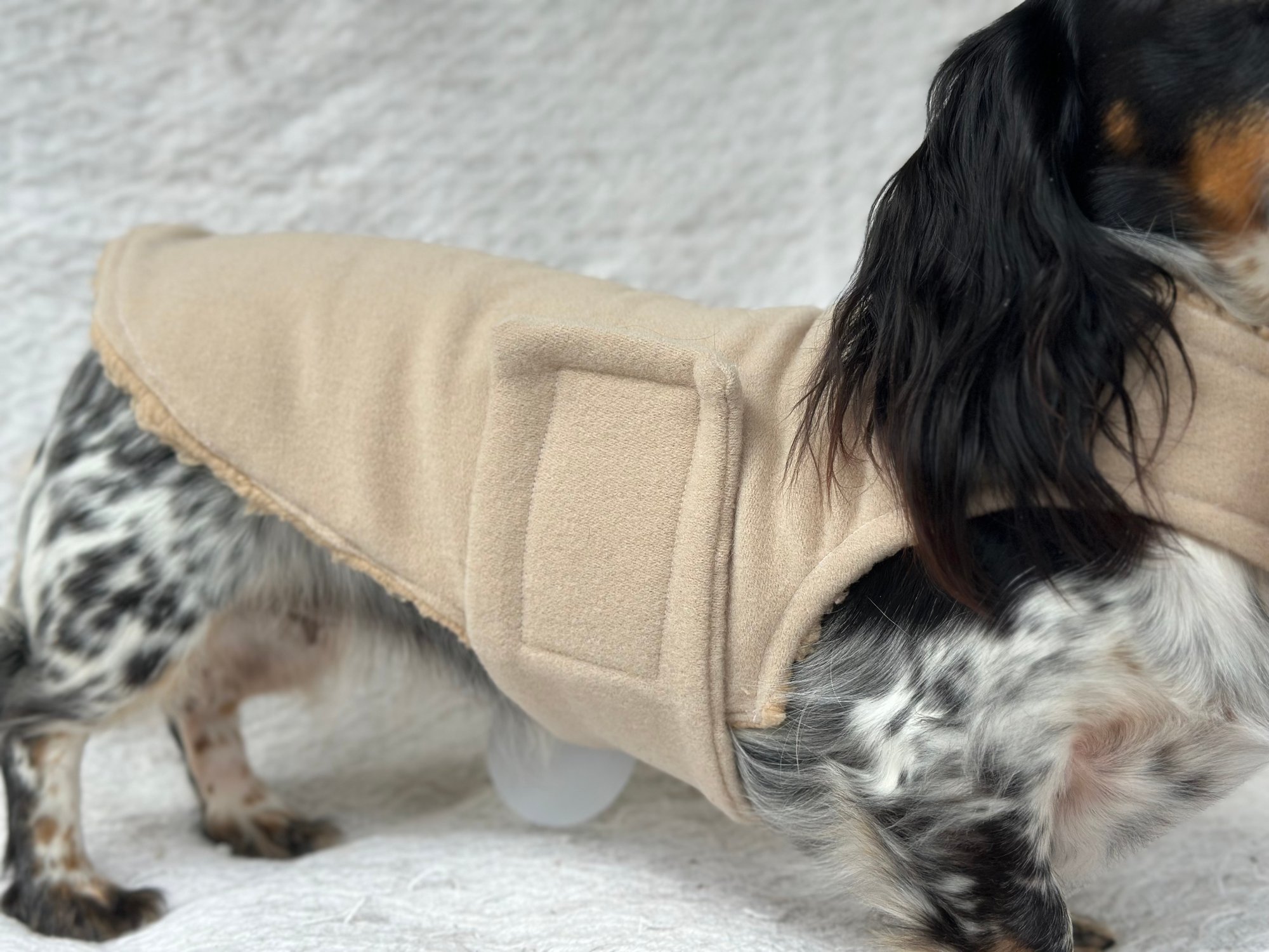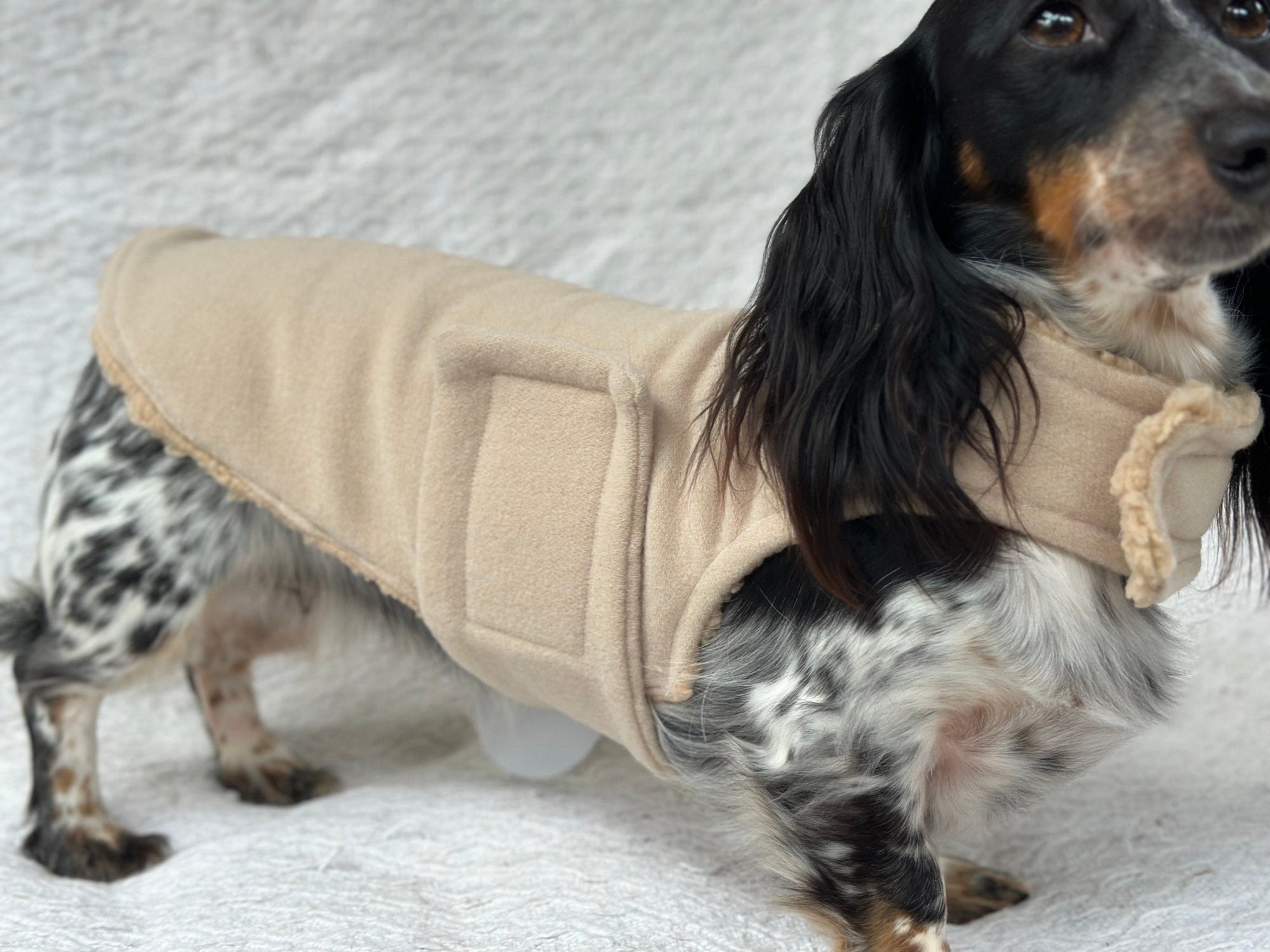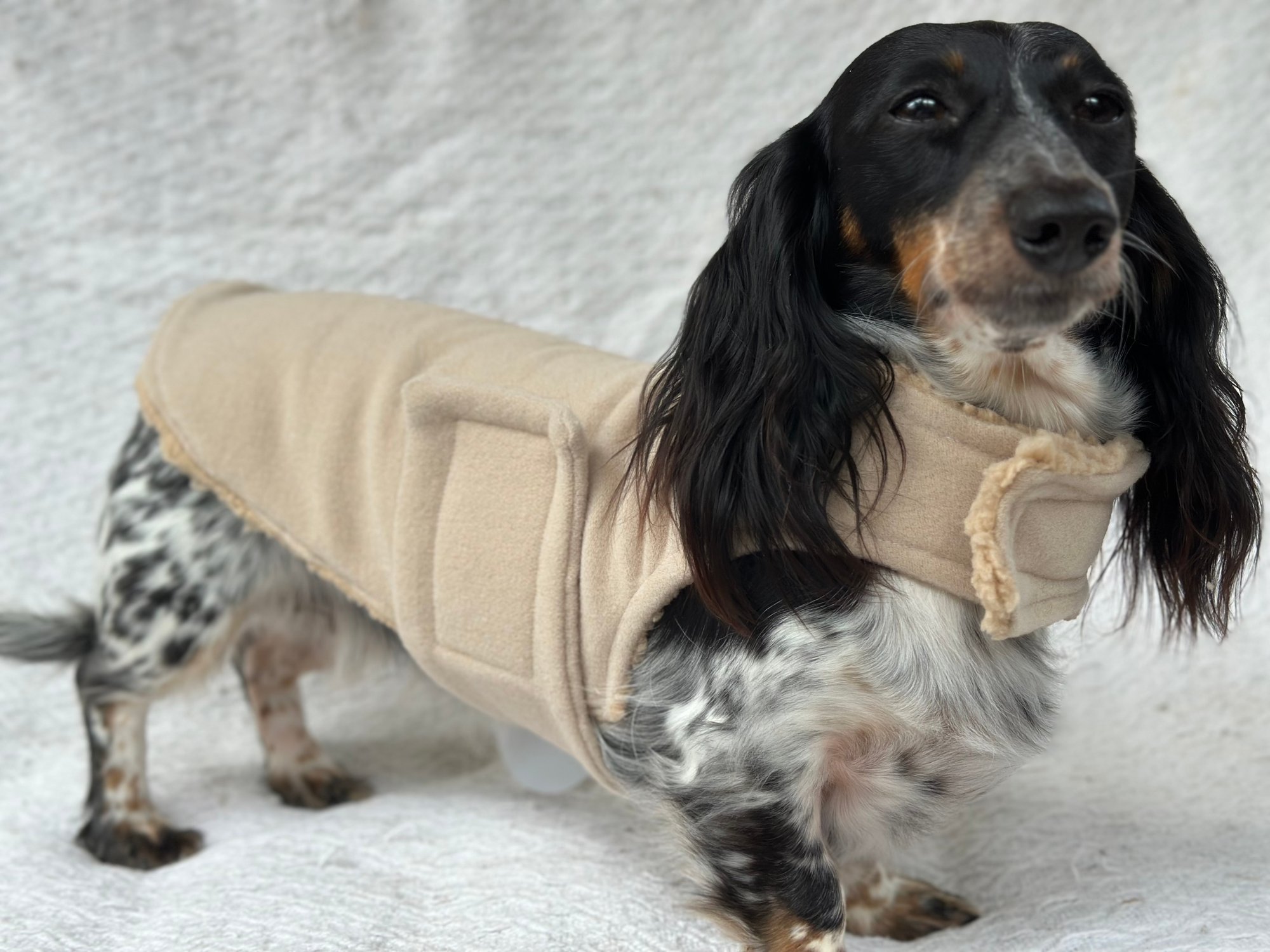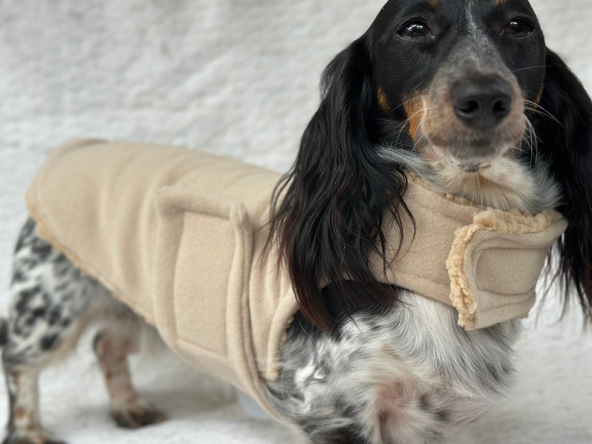 Our Coats are the perfect winter coat for your dachshund or small breed dog! They are made with a more shallow depth for our short legged friends in mind, so their legs do not get caught up in the coat. They are the softest, most snuggly coats you’ll find and have been designed by a dachshund owner who understands their unique body shape.