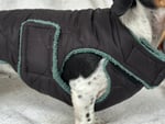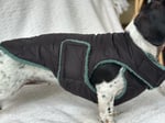 This is our new chest cover design. It covers your dogs chest with an adjustable neck and girth. The neck sits slightly lower than our original coat design, the chest piece wraps around under the chest and velcros up in both sides behind the front legs.