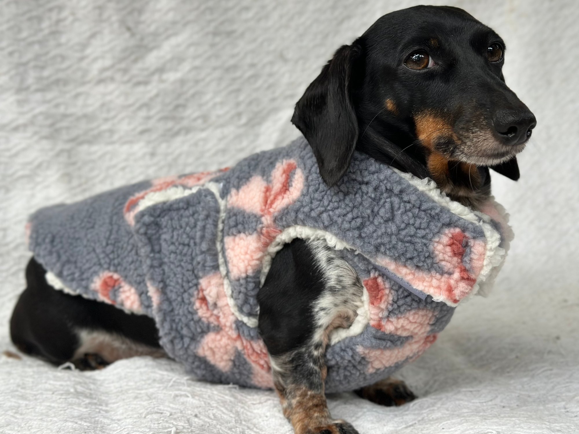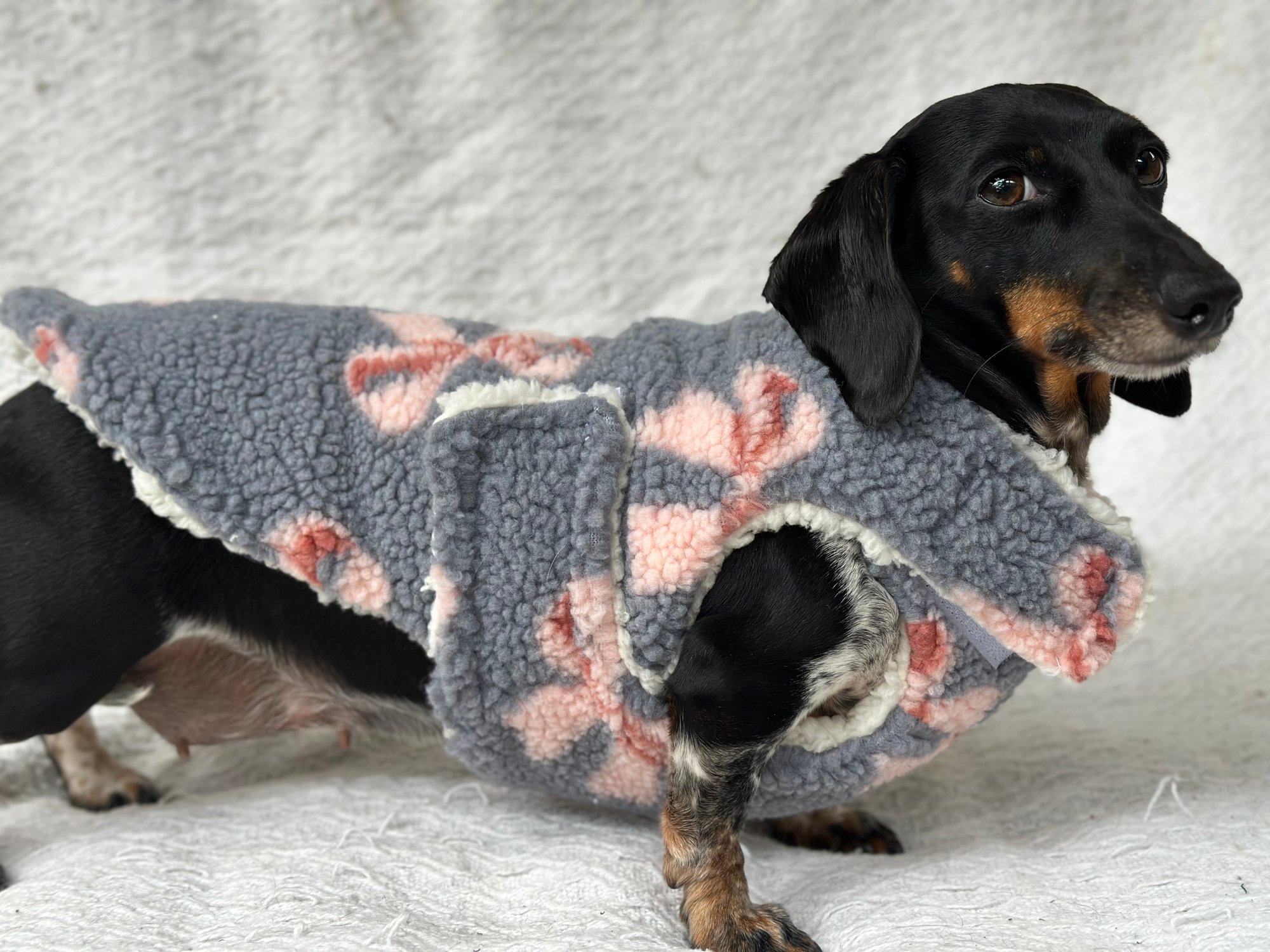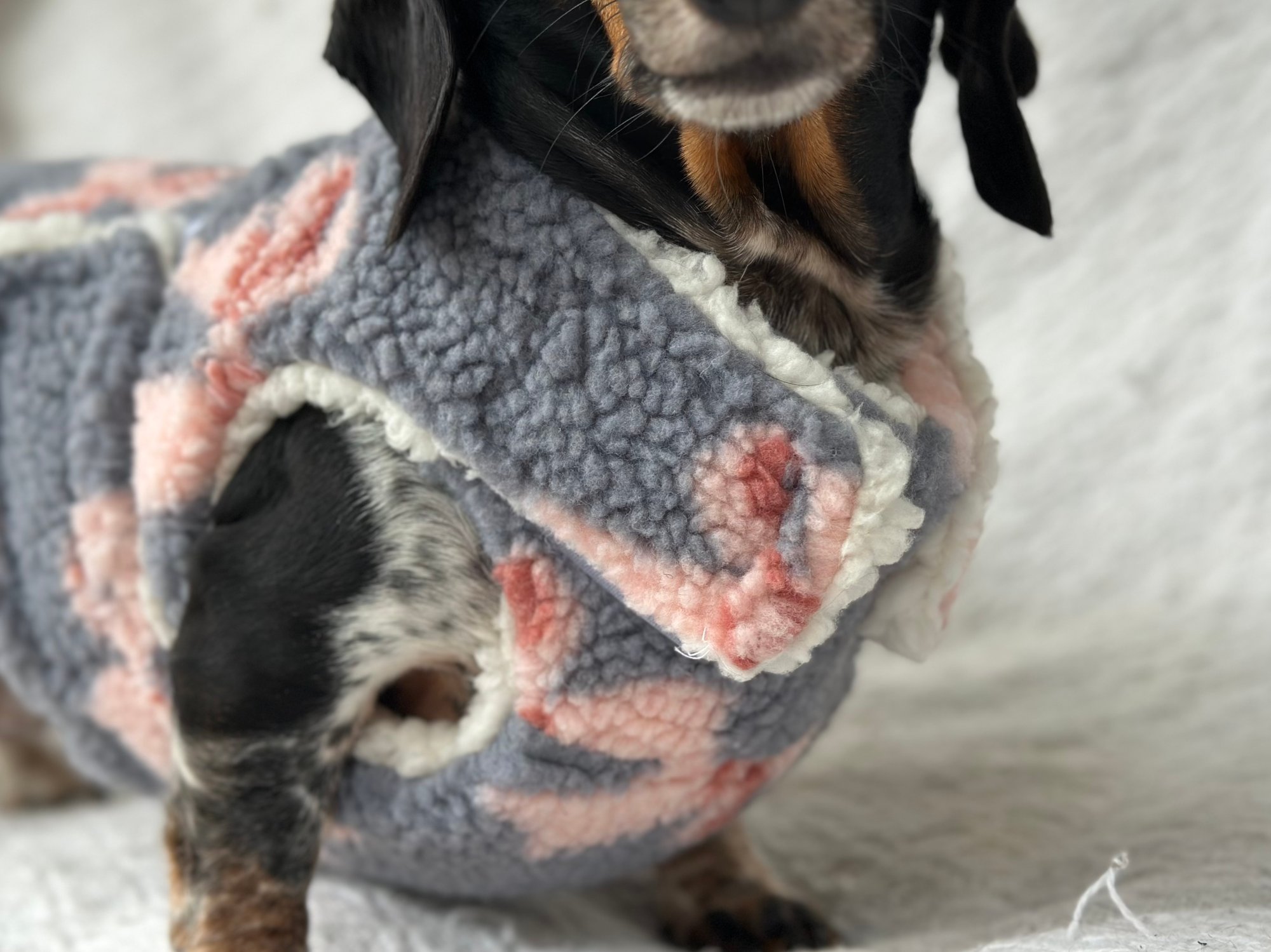 Our Coats are the perfect winter coat for your dachshund or small breed dog! They are made with a more shallow depth for our short legged friends in mind, so their legs do not get caught up in the coat. They are the softest, most snuggly coats you’ll find and have been designed by a dachshund owner who understands their unique body shape.